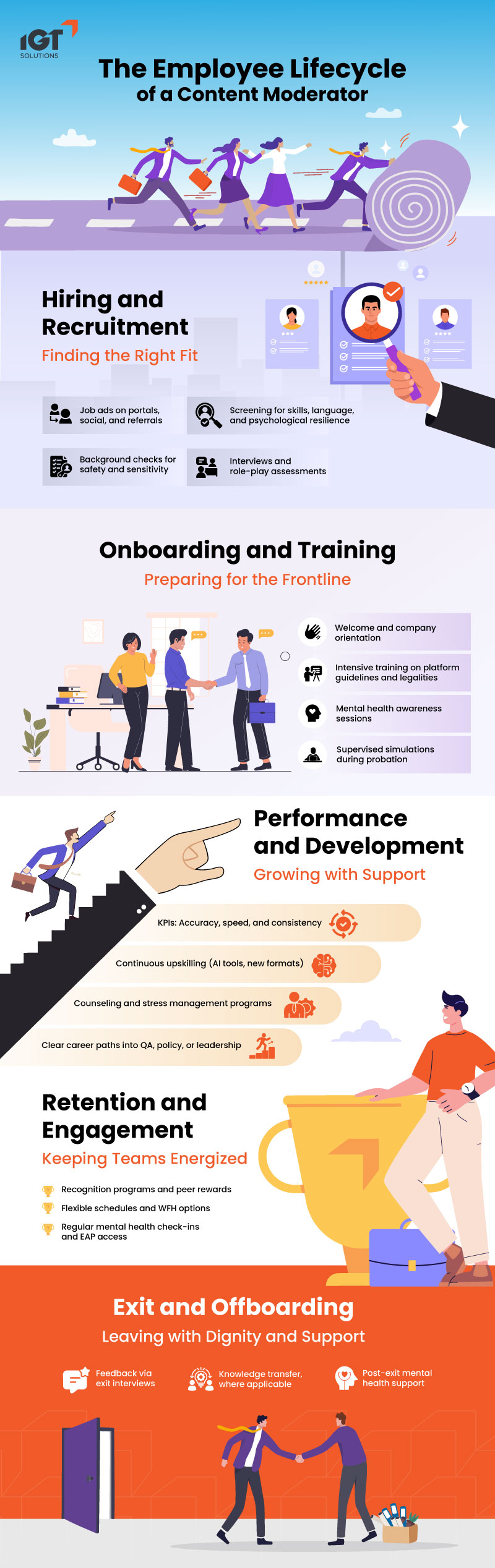 This infographic outlines the employee lifecycle of content moderators, spotlighting key touchpoints and best practices that drive their long-term success.