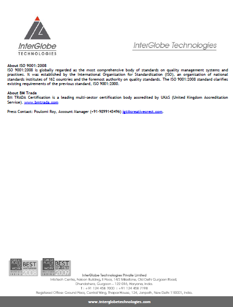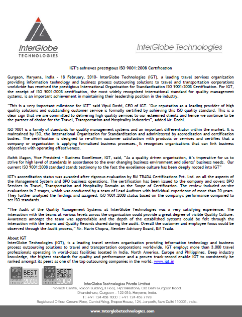 Press ReleaseIGT achieves prestigious ISO 9001:2008 Certification .February 18, 2010 Thought Leadership anemptytextlline Contact Us anemptytextlline