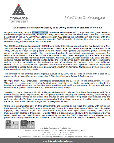 Press ReleaseIGT becomes 1st Travel BPO Globally to be COPC® certified on standard version 4.323 March, 2010 Thought Leadership anemptytextlline Contact Us anemptytextlline