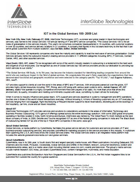 Press ReleaseIGT in Global Services 100- 2009 ListJanuary 27, 2009 Thought Leadership anemptytextlline Contact Us anemptytextlline